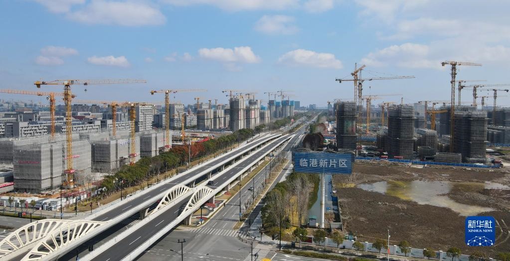 中國(上海)自由貿(mào)易試驗區(qū)臨港新片區(qū)申港大道兩側(cè)塔吊林立(2022年2月10日攝,無人機照片)。新華社記者 方喆 攝