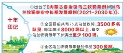 黨的十八大以來,烏蘭牧騎事業(yè)發(fā)展進(jìn)入快車道。自治區(qū)制定了一系列加快推進(jìn)烏蘭牧騎事業(yè)發(fā)展的政策,出臺(tái)了《內(nèi)蒙古自治區(qū)烏蘭牧騎條例》和《烏蘭牧騎事業(yè)中長(zhǎng)期發(fā)展規(guī)劃(2021-2030年)》。設(shè)立全區(qū)烏蘭牧騎事業(yè)發(fā)展專項(xiàng)經(jīng)費(fèi),為75支烏蘭牧騎配備演出大巴車,新建烏蘭牧騎宮,舉辦烏蘭牧騎藝術(shù)節(jié)、全區(qū)烏蘭牧騎新人新作比賽,開展全區(qū)烏蘭牧騎交流演出、“烏蘭牧騎月”等活動(dòng),促進(jìn)烏蘭牧騎互相學(xué)習(xí)發(fā)展。開發(fā)“網(wǎng)上烏蘭牧騎”PC版網(wǎng)頁和手機(jī)版微信H5,成立烏蘭牧騎輔導(dǎo)工作隊(duì)、志愿服務(wù)工作隊(duì),為基層農(nóng)牧民提供藝術(shù)培訓(xùn)服務(wù)。以“烏蘭牧騎+”的方式深入基層,開展理論宣講、電影放映、法律咨詢等綜合志愿服務(wù)。加強(qiáng)烏蘭牧騎人才隊(duì)伍建設(shè),在錫林郭勒職業(yè)學(xué)院等設(shè)立烏蘭牧騎人才培訓(xùn)基地,舉辦全區(qū)烏蘭牧騎隊(duì)長(zhǎng)培訓(xùn)班、舞臺(tái)藝術(shù)創(chuàng)作培訓(xùn)班等業(yè)務(wù)培訓(xùn)班。組織實(shí)施《烏蘭牧騎原創(chuàng)經(jīng)典作品名錄》工作和《全區(qū)烏蘭牧騎原創(chuàng)經(jīng)典作品傳承工程》。編輯出版《烏蘭牧騎回憶錄》《烏蘭牧騎優(yōu)秀作品選》。組織啟動(dòng)烏蘭牧騎知識(shí)產(chǎn)權(quán)保護(hù)工作。