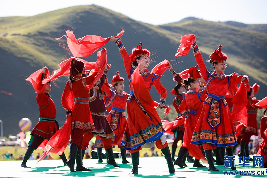 8月8日,烏蘭牧騎的隊(duì)員在開幕式上踏歌起舞。新華網(wǎng)發(fā)(丁根厚攝)