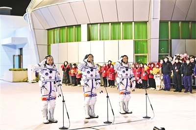 據(jù)中國載人航天工程辦公室消息,11月29日20時(shí)18分,神舟十五號載人飛行任務(wù)航天員乘組出征儀式在酒泉衛(wèi)星發(fā)射中心問天閣圓夢園廣場舉行。航天員費(fèi)俊龍(中)、鄧清明(右)、張陸在出征儀式上。汪江波攝