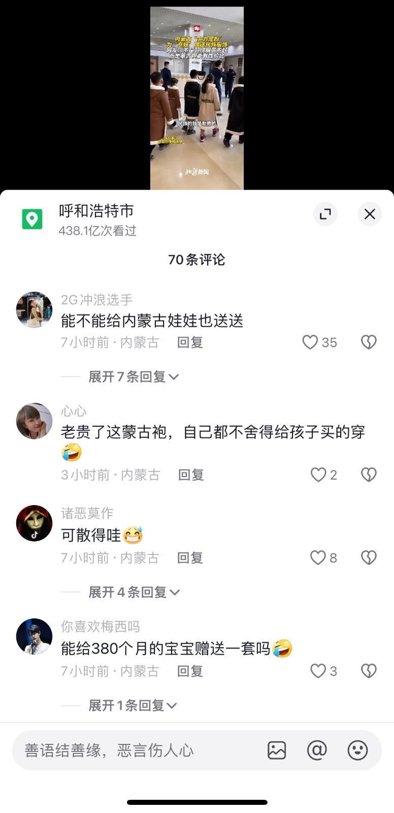 內(nèi)蒙古為了招待北京來的萌娃們,直接送了溫暖的蒙古袍,對于這些,本地人的反應(yīng)是:“能不能給內(nèi)蒙古娃娃也送送”“能給380個月的寶寶贈送一套嗎”。還有本地人表示,“蒙古袍子就送了”“老貴了這蒙古袍,自己都不舍得給孩子買的穿”。