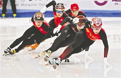 2月17日,吉林隊選手孫龍(右)在短道速滑公開組男子500米決賽中領(lǐng)滑。當(dāng)日,在“十四冬”短道速滑公開組500米比賽中,吉林隊選手孫龍、張楚桐將男子、女子500米項目兩枚金牌收入囊中。草原全媒·正北方網(wǎng)記者 孟和朝魯 攝