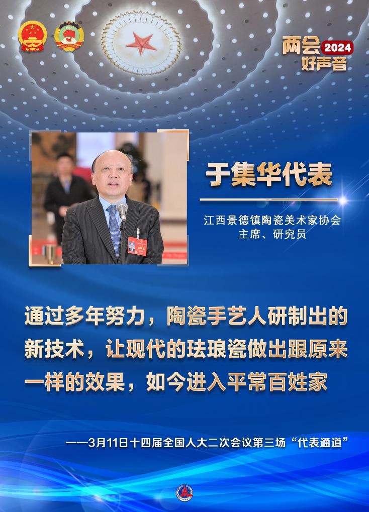 江西景德鎮(zhèn)陶瓷美術(shù)家協(xié)會主席、研究員于集華代表說,通過多年努力,陶瓷手藝人研制出的新技術(shù),讓現(xiàn)代的琺瑯瓷做出跟原來一樣的效果,如今進(jìn)入平常百姓家。