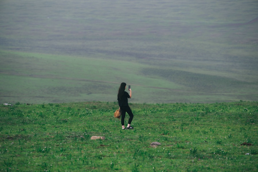 游客在草原拍照打卡
