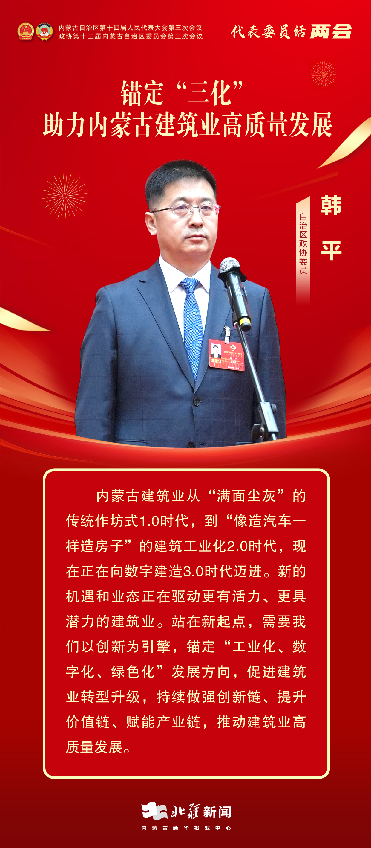 北疆新聞呼和浩特1月13日電(記者 張?chǎng)?李姝廷)委員通道,通民心、道發(fā)展。1月13日上午,自治區(qū)兩會(huì)首場(chǎng)“委員通道”正式開(kāi)啟。自治區(qū)政協(xié)委員,興泰建設(shè)集團(tuán)有限公司黨委書(shū)記、董事長(zhǎng)韓平圍繞“建筑業(yè)高質(zhì)量發(fā)展”的內(nèi)容建真言、獻(xiàn)良策。