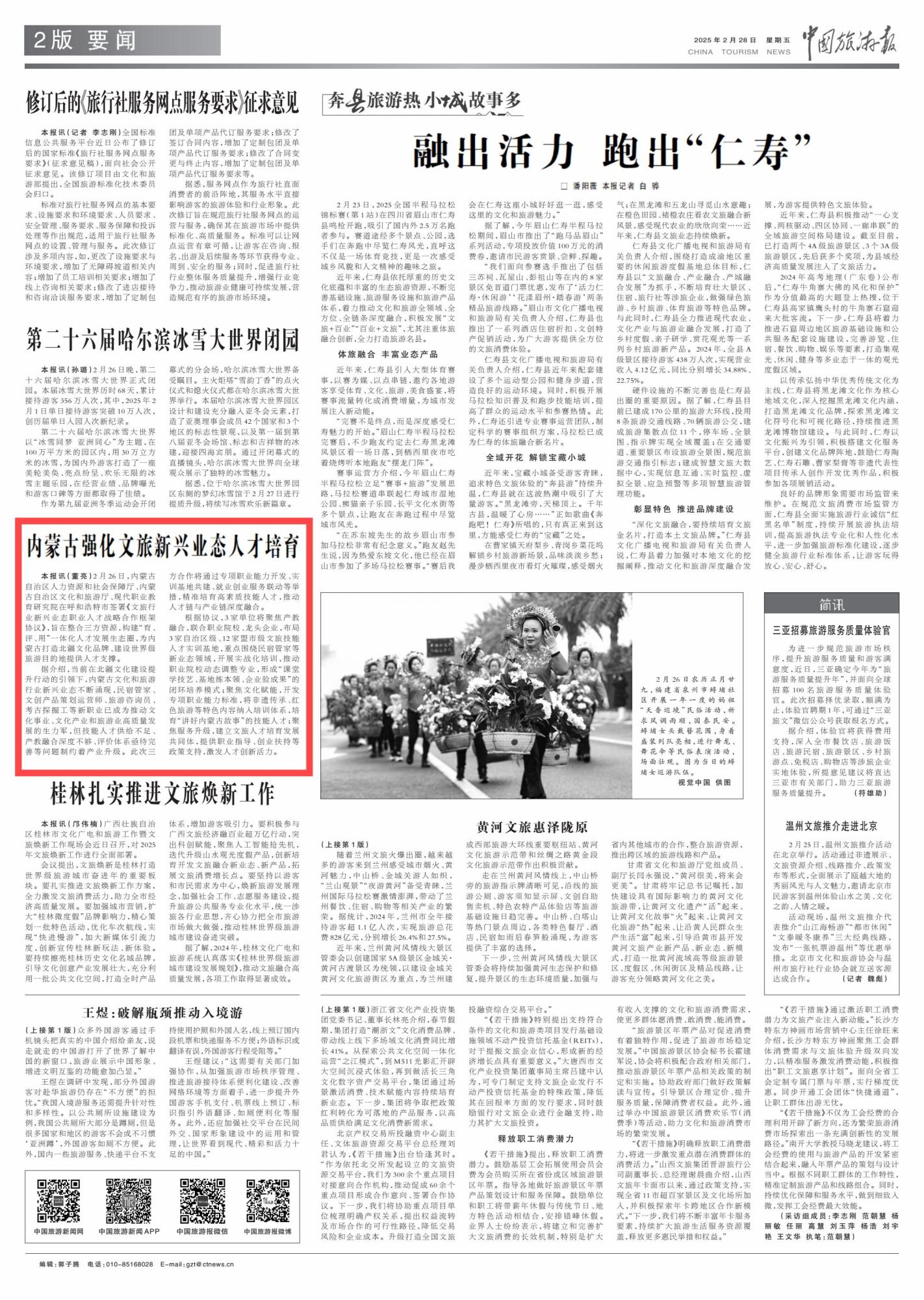 2015年2月28日,《中國(guó)旅游報(bào)》第2版刊發(fā)題為《內(nèi)蒙古強(qiáng)化文旅新興業(yè)態(tài)人才培育》的消息,報(bào)道了內(nèi)蒙古整合三方資源,構(gòu)建“育、評(píng)、用”一體化人才發(fā)展生態(tài)圈,為內(nèi)蒙古打造北疆文化品牌、建設(shè)世界級(jí)旅游目的地提供人才支撐。