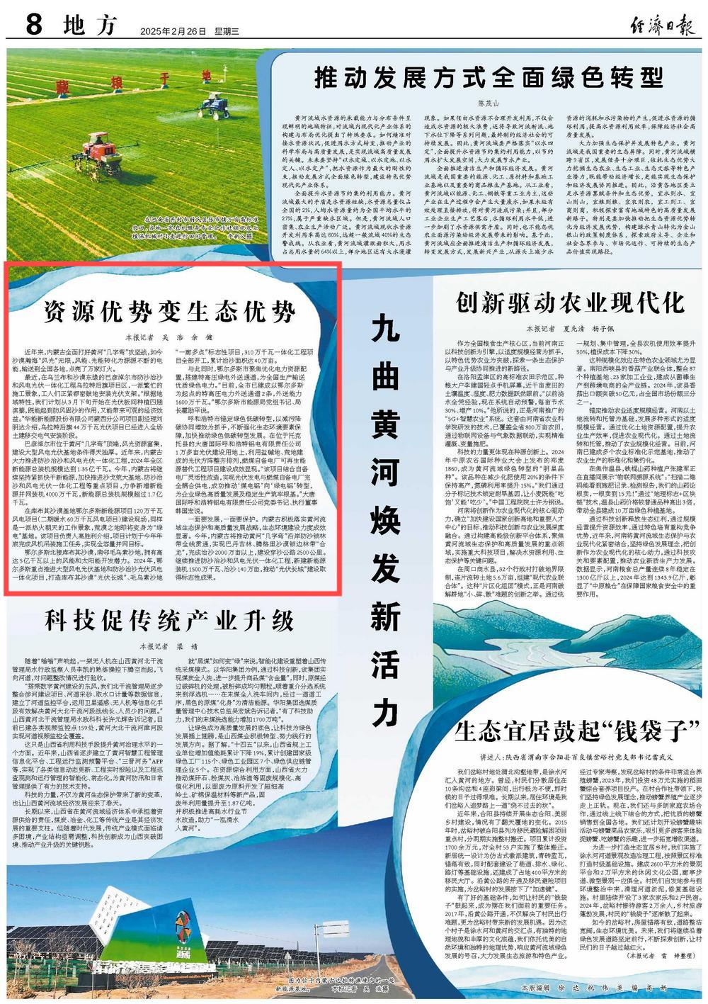 2025年2月26日,《經(jīng)濟(jì)日?qǐng)?bào)》第8版刊發(fā)題為《資源優(yōu)勢(shì)變生態(tài)優(yōu)勢(shì)》的文章,報(bào)道了近年來,內(nèi)蒙古全面打好黃河“幾字彎”攻堅(jiān)戰(zhàn),如今沙漠瀚海“風(fēng)光”無限,風(fēng)能、光能轉(zhuǎn)化為源源不斷的電能,輸送到全國各地,點(diǎn)亮了萬家燈火。