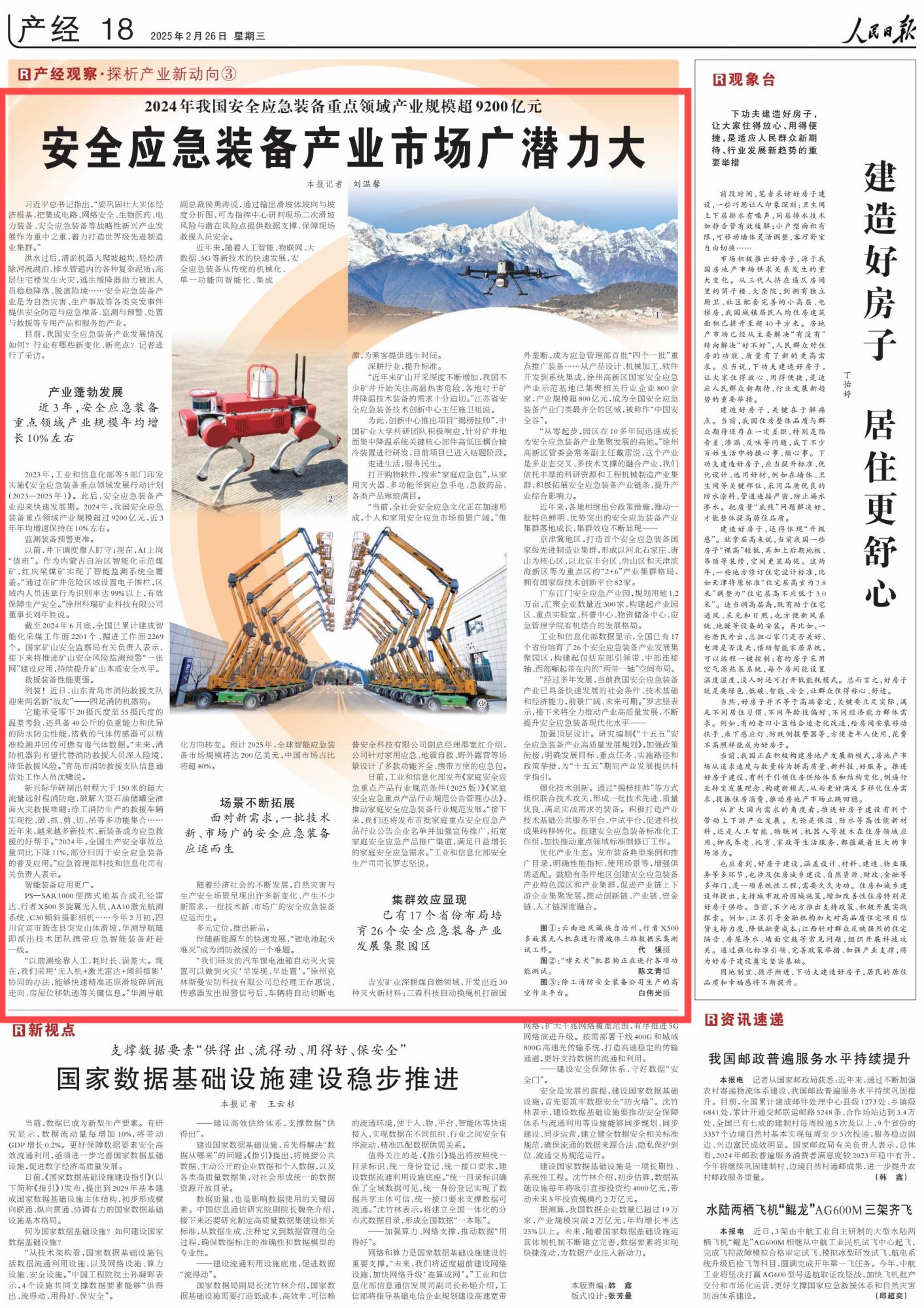 2025年2月26日,《人民日?qǐng)?bào)》第18版刊發(fā)題為《2024年我國(guó)安全應(yīng)急裝備重點(diǎn)領(lǐng)域產(chǎn)業(yè)規(guī)模超9200億元 安全應(yīng)急裝備產(chǎn)業(yè)市場(chǎng)廣潛力大》的報(bào)道,2024年,我國(guó)安全應(yīng)急裝備重點(diǎn)領(lǐng)域產(chǎn)業(yè)規(guī)模超過(guò)9200億元,其中,內(nèi)蒙古自治區(qū)紅慶梁煤礦實(shí)現(xiàn)了智能監(jiān)測(cè)系統(tǒng)全覆蓋。