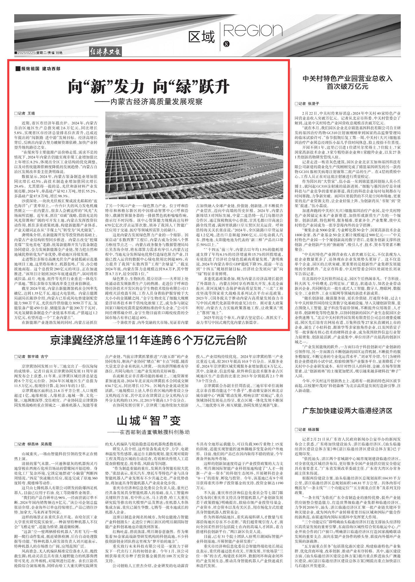 2025年2月25日《經(jīng)濟(jì)參考報(bào)》第8版刊發(fā)了《向“新”發(fā)力 向“綠”躍升——內(nèi)蒙古經(jīng)濟(jì)高質(zhì)量發(fā)展觀察》的文章,報(bào)道了多重優(yōu)惠政策疊加,為內(nèi)蒙古經(jīng)濟(jì)高增長提供了外部助力,經(jīng)濟(jì)社會(huì)發(fā)展向“新”向“綠”特征非常鮮明,讓政策從“紙上”落到“地上”。