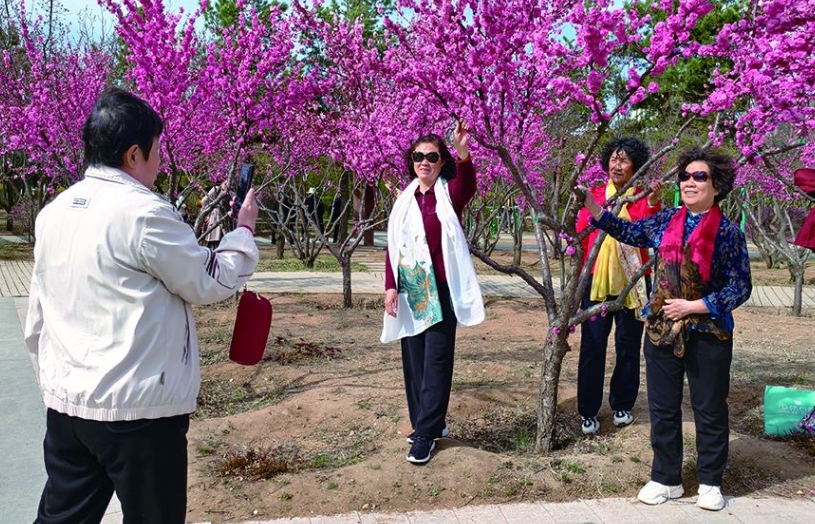 走進植物園,道路兩側(cè)的榆葉梅競相綻放,粉紅色的花朵層層疊疊掛滿枝頭,形成一片爛漫花海。從浙江來的游客李筱正用手機記錄美景:“原本擔(dān)心錯過北方花期,沒想到這里的榆葉梅開得這么漂亮,完全不輸江南的春天。”