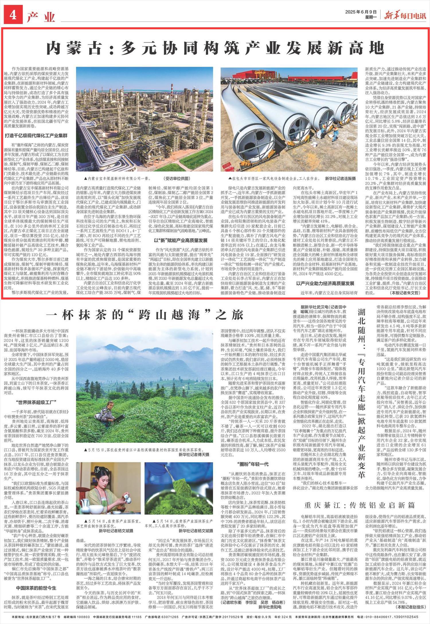 2025年6月9日《新華每日電訊》第4版刊發(fā)了《內(nèi)蒙古:多元協(xié)同構(gòu)筑產(chǎn)業(yè)發(fā)展新高地》的文章,報(bào)道了內(nèi)蒙古依托深厚的煤炭資源大力發(fā)展現(xiàn)代煤化工產(chǎn)業(yè),構(gòu)建起千億級(jí)的產(chǎn)業(yè)集群。憑借資源優(yōu)勢(shì)和精準(zhǔn)的產(chǎn)業(yè)發(fā)展戰(zhàn)略,內(nèi)蒙古正加速構(gòu)建多元協(xié)同的產(chǎn)業(yè)發(fā)展體系,在祖國(guó)北疆書(shū)寫產(chǎn)業(yè)高質(zhì)量發(fā)展新畫卷。