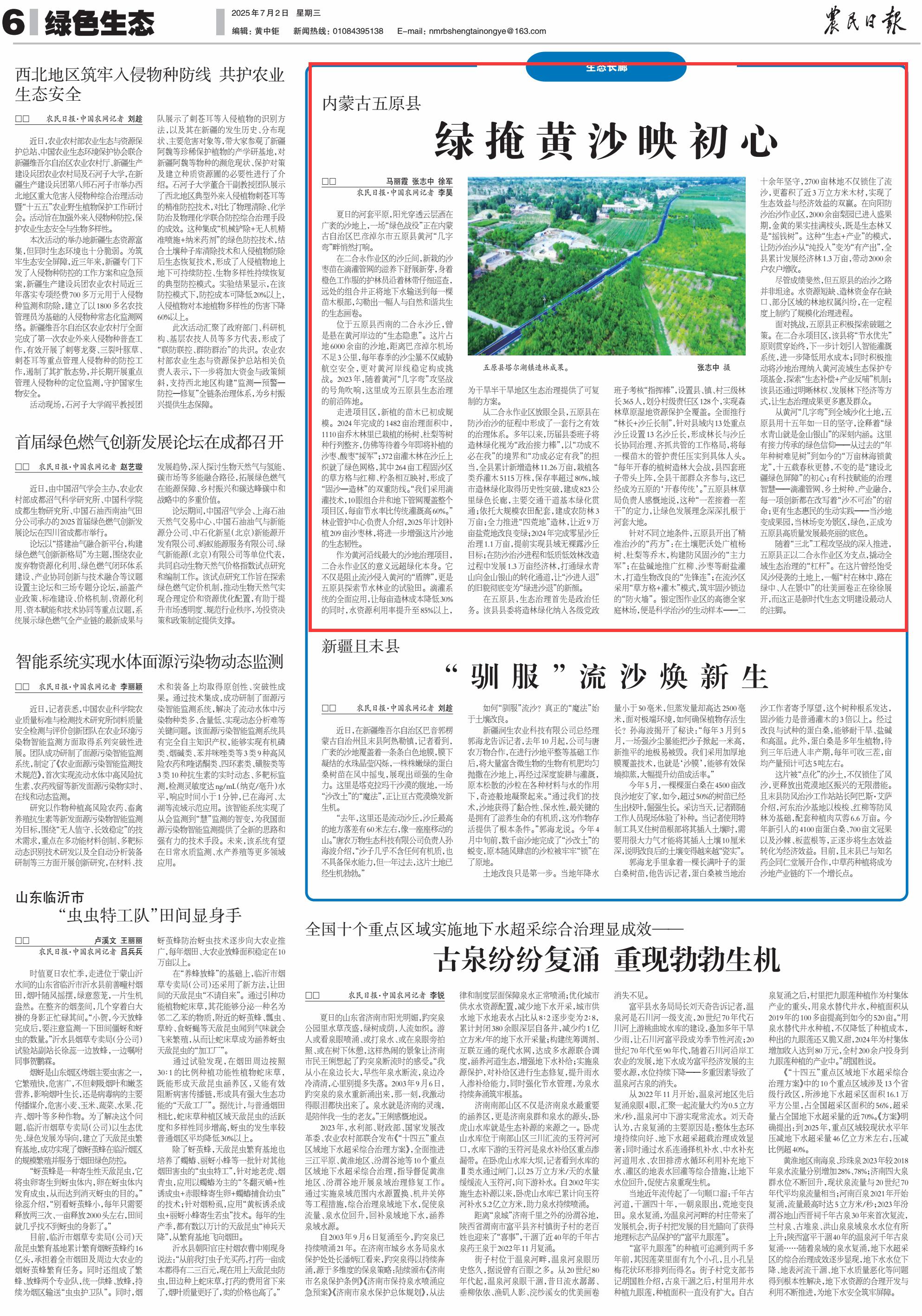 2025年7月2日《農(nóng)民日報》第6版刊發(fā)了《內(nèi)蒙古五原縣綠掩黃沙映初心》的文章,報道了從黃河“幾字彎”到全域沙化土地,內(nèi)蒙古自治區(qū)巴彥淖爾市五原縣用十五年如一日的堅守,詮釋著“綠水青山就是金山銀山”的深刻內(nèi)涵。當(dāng)沙地變成果園,當(dāng)林場變?yōu)榫皡^(qū),綠色,正成為五原縣高質(zhì)量發(fā)展最亮麗的底色。