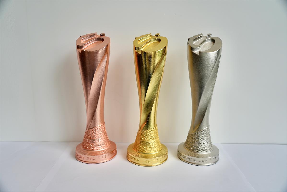 獎(jiǎng)杯頂部為會(huì)徽“奮進(jìn)”,以傾斜45度的方式呈現(xiàn);外形采用扭轉(zhuǎn)升騰樣式設(shè)計(jì),體現(xiàn)了各民族運(yùn)動(dòng)員在少數(shù)民族傳統(tǒng)體育運(yùn)動(dòng)會(huì)賽場(chǎng)上英勇矯健的身姿和拼搏向上的精神。底部為紅山文化彩陶雙旋紋環(huán)繞四周,并鐫刻“2025·赤峰”,既展現(xiàn)中華優(yōu)秀傳統(tǒng)文化,又明確了本屆運(yùn)動(dòng)會(huì)舉辦地區(qū)及時(shí)間,激勵(lì)各民族運(yùn)動(dòng)員以參加本屆全區(qū)少數(shù)民族傳統(tǒng)體育運(yùn)動(dòng)會(huì)為榮耀,傳承和弘揚(yáng)民族傳統(tǒng)體育文化,構(gòu)筑中華民族共有精神家園,鑄牢中華民族共同體意識(shí)。獎(jiǎng)杯整體開模澆鑄,鋅合金制作,表面電鍍金、銀、銅顏色。(記者 肖璐)