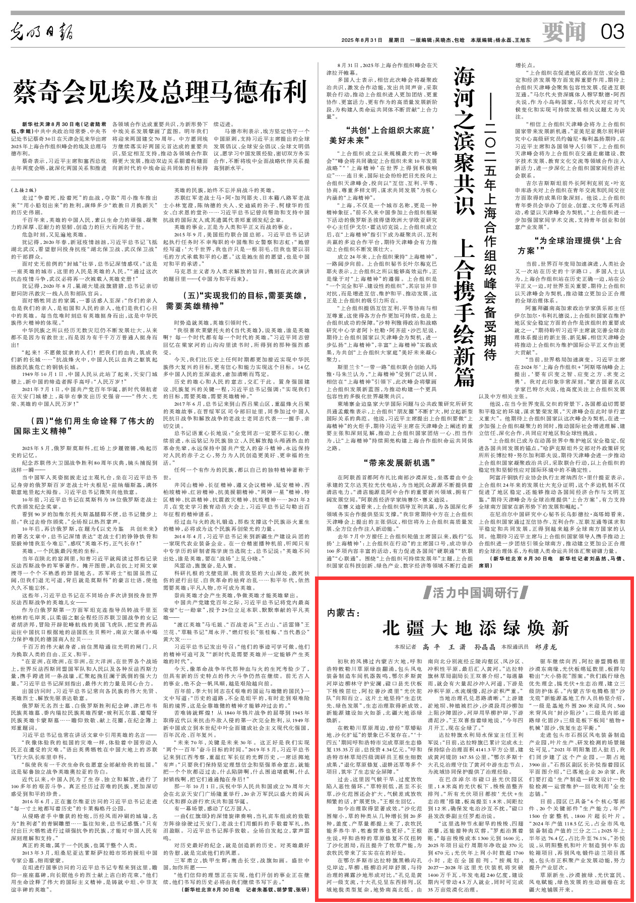 2025年8月31日,《光明日報(bào)》第3版刊發(fā)題為《內(nèi)蒙古:北疆大地添綠煥新》的文章,報(bào)道了內(nèi)蒙古堅(jiān)持“生態(tài)優(yōu)先、綠色發(fā)展”,生態(tài)治理取得新成效,新能源建設(shè)如火如荼,北疆大地添綠煥新。