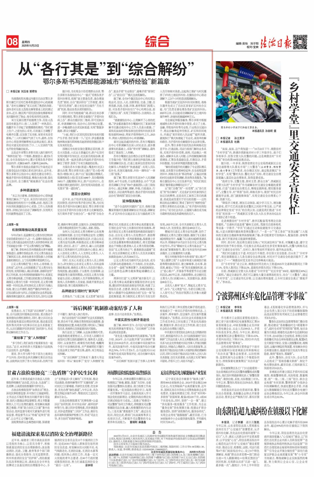 2025年10月23日,《法治日報》第8版刊發(fā)題為《從“各行其是”到“綜合解紛”鄂爾多斯書寫西部能源城市“楓橋經(jīng)驗”新篇章》的文章,報道了鄂爾多斯市以綜治中心規(guī)范化建設(shè)為核心,深入踐行新時代“楓橋經(jīng)驗”,通過多元舉措化解矛盾糾紛,全力打造“暖城善治”社會治理品牌。截至9月底,全市各級綜治中心累計受理各類矛盾糾紛22371件,化解率達(dá)96.03%。