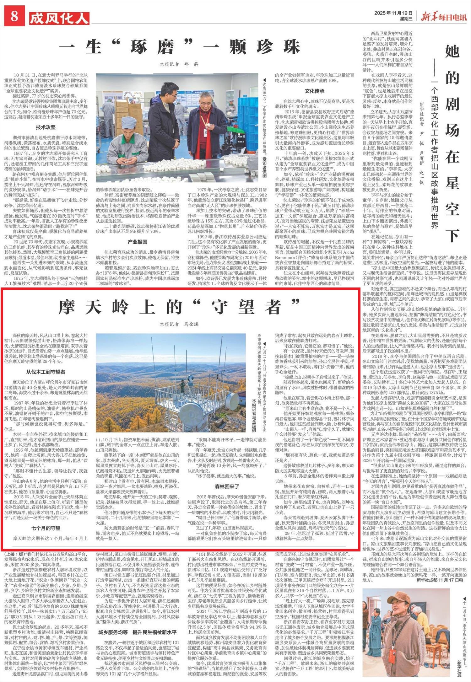 2025年11月19日,《新華每日電訊》第8版刊發(fā)題為《摩天嶺上的“守望者”》的文章,報(bào)道了摩天嶺位于內(nèi)蒙古呼倫貝爾市牙克石市綽河源鎮(zhèn)西南40公里處,是大興安嶺嶺南的第二高峰。火情瞭望員孫忠全站在瞭望塔頂,雙手扶著冰涼的欄桿,目光沿著山勢(shì)一點(diǎn)點(diǎn)延展。他舉起望遠(yuǎn)鏡,搜尋著山坳深處的每一個(gè)角落。這已是他在摩天嶺守望的第29個(gè)年頭。