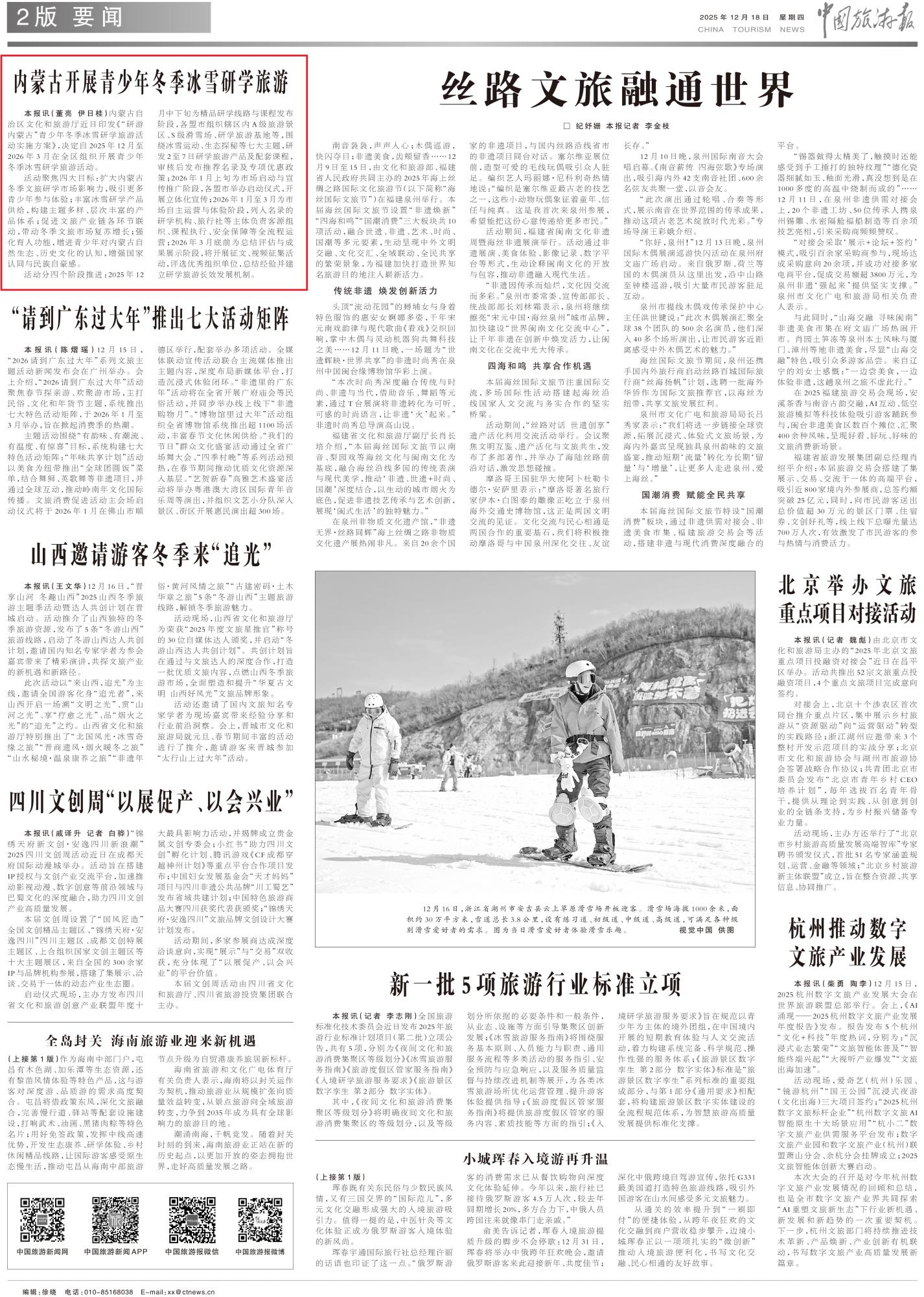 2025年12月18日《中國旅游報(bào)》第2版刊發(fā)了《內(nèi)蒙古開展青少年冬季冰雪研學(xué)旅游》的文章,報(bào)道了內(nèi)蒙古自治區(qū)文化和旅游廳近日印發(fā)《“研游內(nèi)蒙古”青少年冬季冰雪研學(xué)旅游活動(dòng)實(shí)施方案》,決定自2025年12月至2026年3月在全區(qū)組織開展青少年冬季冰雪研學(xué)旅游活動(dòng)。