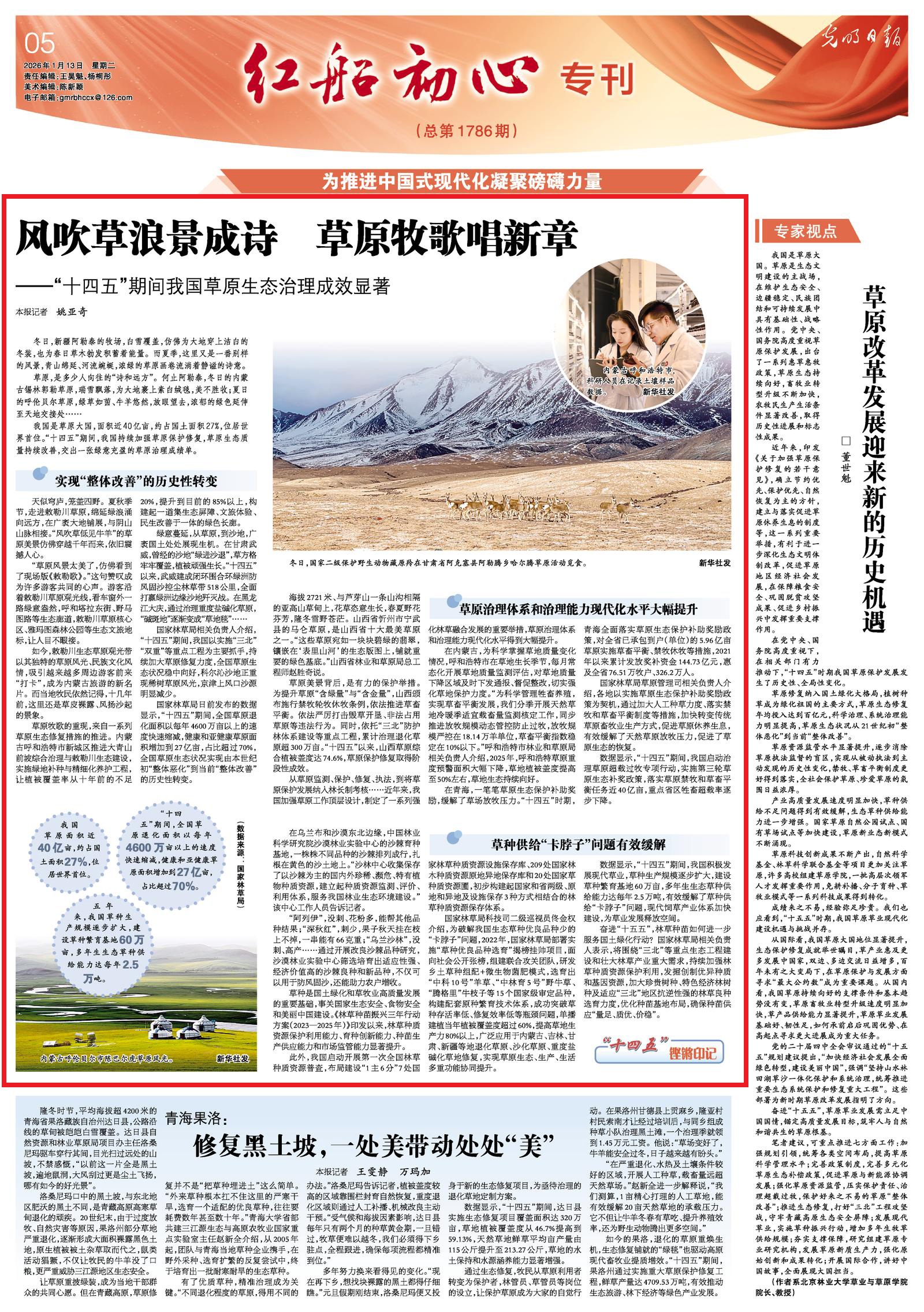 2026年1月13日,《光明日?qǐng)?bào)》5版刊發(fā)題為《風(fēng)吹草浪景成詩(shī) 草原牧歌唱新章——“十四五”期間我國(guó)草原生態(tài)治理成效顯著》的文章,報(bào)道了“十四五”期間,我國(guó)持續(xù)加強(qiáng)草原保護(hù)修復(fù),草原生態(tài)質(zhì)量持續(xù)改善,交出一張綠意充盈的草原治理成績(jī)單。