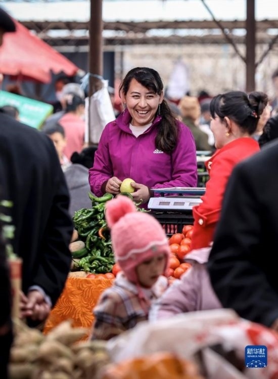 2月26日,在托克扎克鎮(zhèn)農(nóng)貿(mào)市場(chǎng),蔬菜商販和顧客交流。
