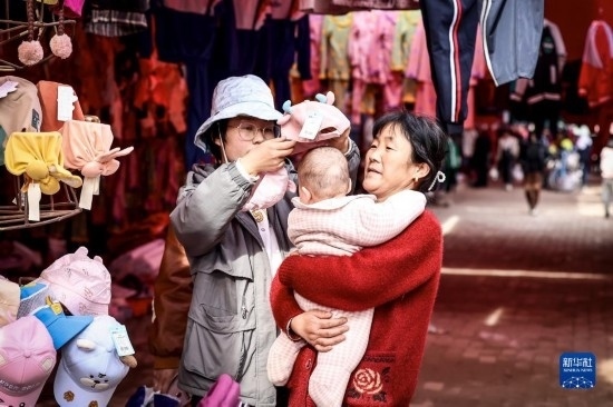 2月26日,在托克扎克鎮(zhèn)農(nóng)貿(mào)市場(chǎng),一名女士在給孩子挑選帽子。