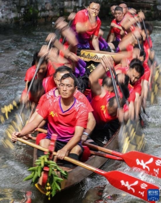 龍船漂移時,船頭船尾的舵手專門負責(zé)入彎出彎時的線路和速度控制(6月22日攝)。