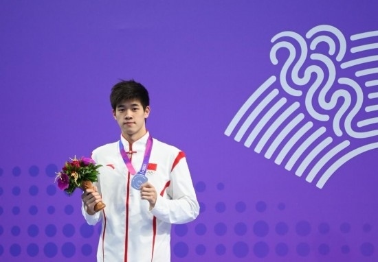 2023年9月27日,亞軍中國選手潘展樂在杭州亞運(yùn)會(huì)游泳項(xiàng)目男子200米自由泳的頒獎(jiǎng)儀式上。新華社記者 黃宗治 攝