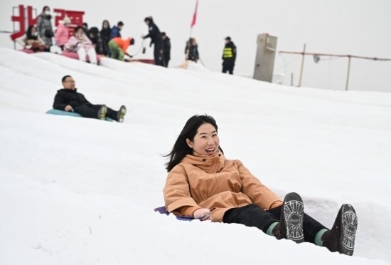 冬季的內(nèi)蒙古賽馬場(chǎng)變成了冰雪樂(lè)園,場(chǎng)地中間建起一座十幾米高的人造雪山,等著玩滑雪圈的人群從山頂一直排到山腳下,周?chē)€有冰上腳踏車(chē)、冰上陀螺等冰雪體驗(yàn)設(shè)備。曹博雅坐著雪圈從山頂飛速滑下,又拉著爸爸坐上了旋轉(zhuǎn)小雪車(chē)。