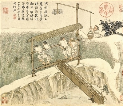 通過品讀繪畫中的水利機具發(fā)展變化,不僅可以直觀感受勞動技術(shù)的進(jìn)步,還有助于從古人識水、用水的智慧中汲取養(yǎng)分。