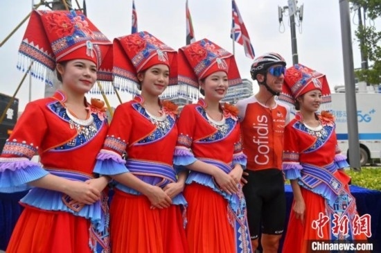 資料圖:2023環(huán)廣西世巡賽,車手與身著民族服飾工作人員合影。俞靖 攝