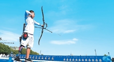 當?shù)貢r間8月24日,在法國巴黎榮軍院旁的射箭訓(xùn)練場內(nèi),中國殘奧射箭隊在進行適應(yīng)性訓(xùn)練。拉弓、瞄準、松弦,中國隊選手甘俊射出正中靶心的一箭后,臉上露出笑容。他表示:“風速、風向?qū)穆潼c影響較大,我會盡快適應(yīng),調(diào)整到最佳狀態(tài)。”甘俊對自己參加的首屆殘奧會充滿期待。