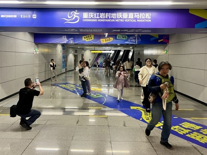 國慶前夕,這里剛舉辦了一場垂直馬拉松。賽事帶來品牌效應,前來打卡的人群絡(luò)繹不絕。“垂直馬拉松一般在摩天大樓里舉辦,如今地鐵站里居然能跑馬拉松,重慶總是能給游客帶來驚喜?!眮碜院颖钡挠慰蛷堥f。