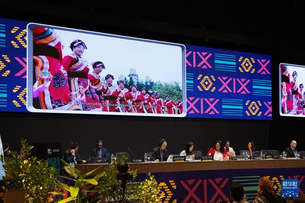 12月5日,在巴拉圭亞松森聯(lián)合國教科文組織保護非物質文化遺產政府間委員會第19屆常會評審現(xiàn)場,大屏幕播放“黎族傳統(tǒng)紡染織繡技藝”宣傳視頻。新華社記者 朱雨博 攝