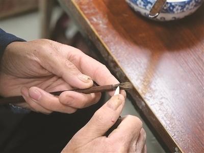 佘征軍在制作宣筆。