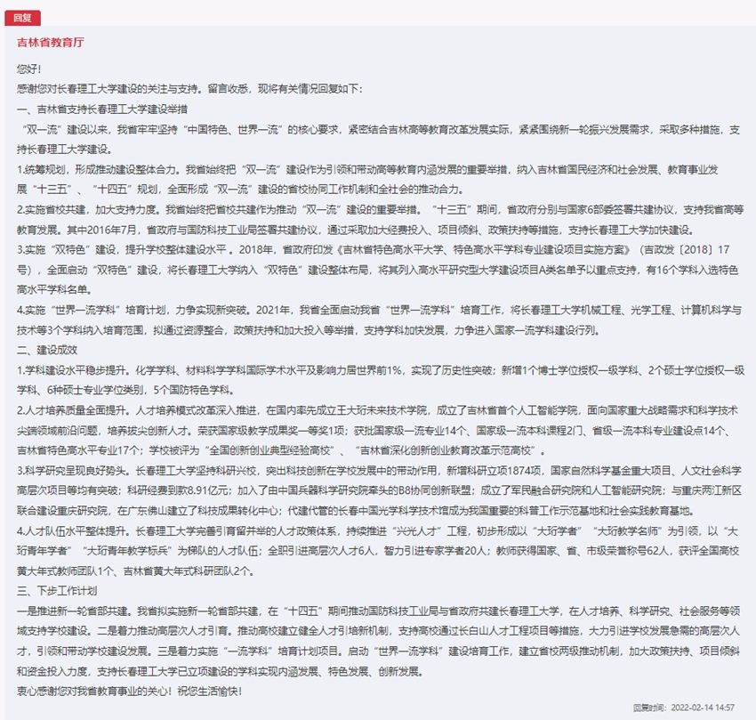 吉林省教育廳回復了網友的留言,并對吉林省高校建設工作進行了詳細闡述。