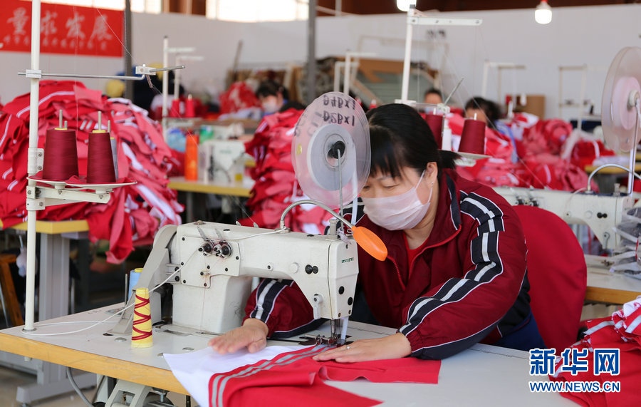 3月31日,呼和浩特市的服裝加工企業(yè)工人在校服生產(chǎn)線工作。連日來,呼和浩特市服裝加工企業(yè)在做好疫情防控工作同時,組織員工抓緊趕制校服,全力保障市場供應(yīng)。新華網(wǎng)發(fā) (馮磊 攝)